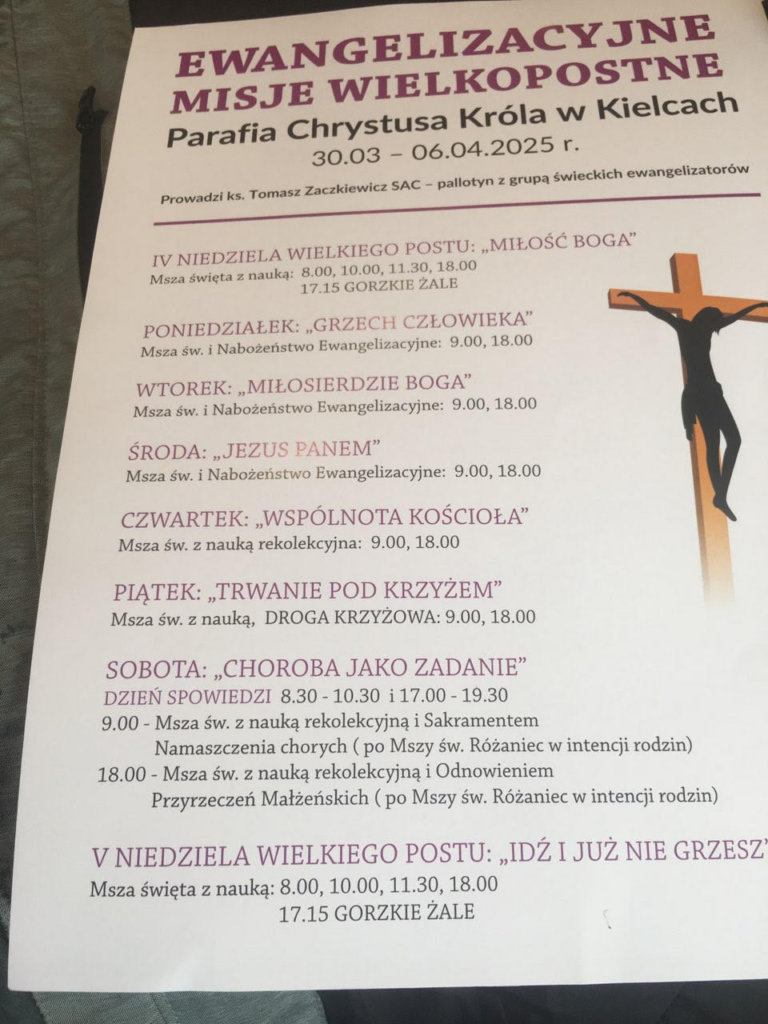 2) W tym roku szczególnym przygotowaniem do Świat Wielkanocnych, są, tzw. MISJE PARAFIALNE, które prowadzi ks. Tomasz Zaczkiewicz, pallotyn, wraz z Zespołem Ewangelizacyjnym wiernych świeckich z Ostrołęki. W ciągu tego tygodnia Misji Parafialnych będą tylko 2 Msze święte w dni powszednie, o godz. 9.00 i o godz. 18.00., z dodatkową modlitwą, Adoracją i świadectwami.